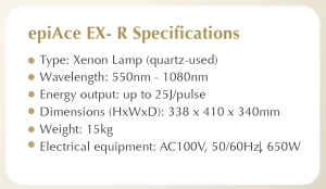 epiAce EX-R provides safer function and improved performance at less purchase and running costs. The service life of lamp unit is guaranteed up to 100,000 shots. (Hair Removal Lamp Unit)