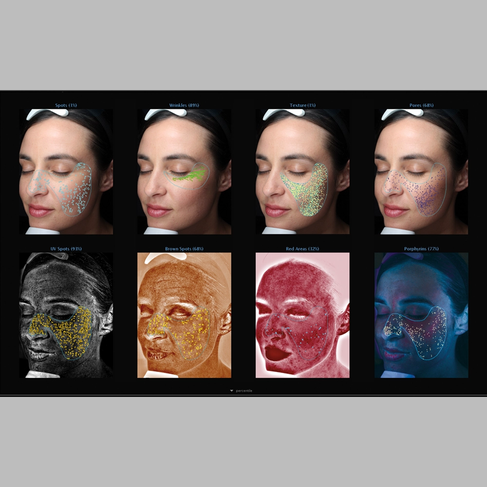 • PERCENTILE SCORES – VISIA’s patented comparison to norms analysis uses the world’s largest skin feature database to grade your patient’s skin relative to others of the same age and skin type. Measure spots, wrinkles, texture, pores, UV spots, brown spots, red areas, and porphyrins.